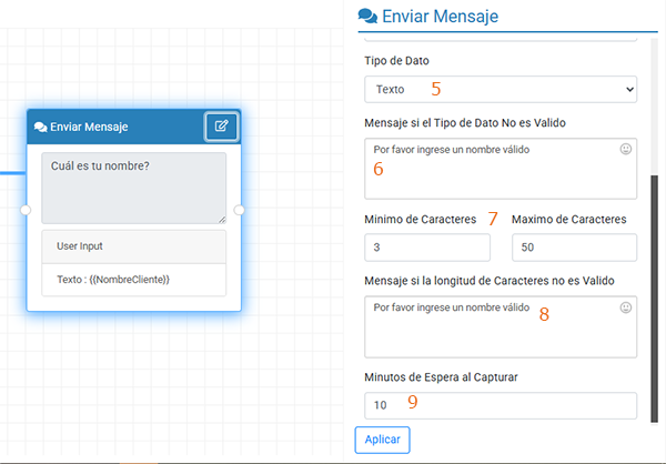 9 - Define los Minutos de Espera al Capturar - Indica el tiempo máximo que el sistema debe esperar la respuesta del usuario antes de continuar o finalizar el flujo. |