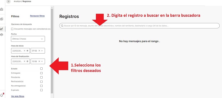 Utilice los registros para obtener información sobre el estado de los mensajes individuales. Puede buscar registros utilizando las siguientes opciones: