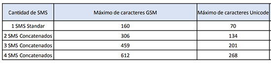 En 1 SMS podrá enviar hasta 160 caracteres (incluyendo espacios) para que el cobro sea de 1 mensaje por contacto. Si se pasa de esta cantidad el cobro será de más de 1 mensaje por contacto, pero si su mensaje contiene tildes o algunos caracteres especiales al lenguaje Unicode, el máximo de caracteres baja de la siguiente manera |